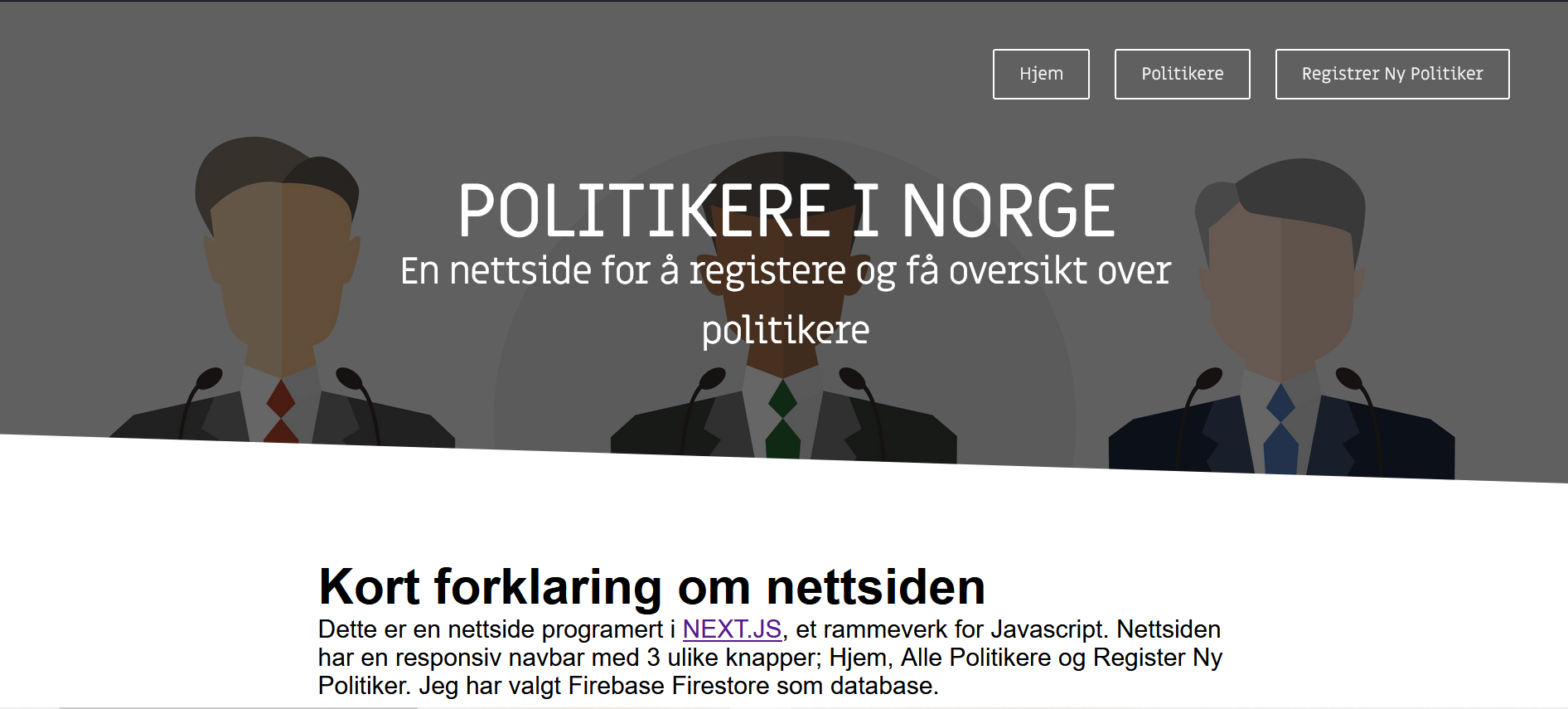 This website is a web application built using the NEXT.JS framework. It allows users to register and keep track of politicians in Norway. The site consists of three main pages: Home, Alle Politikere (All Politicians), and Register Ny Politiker (Register New Politician).
